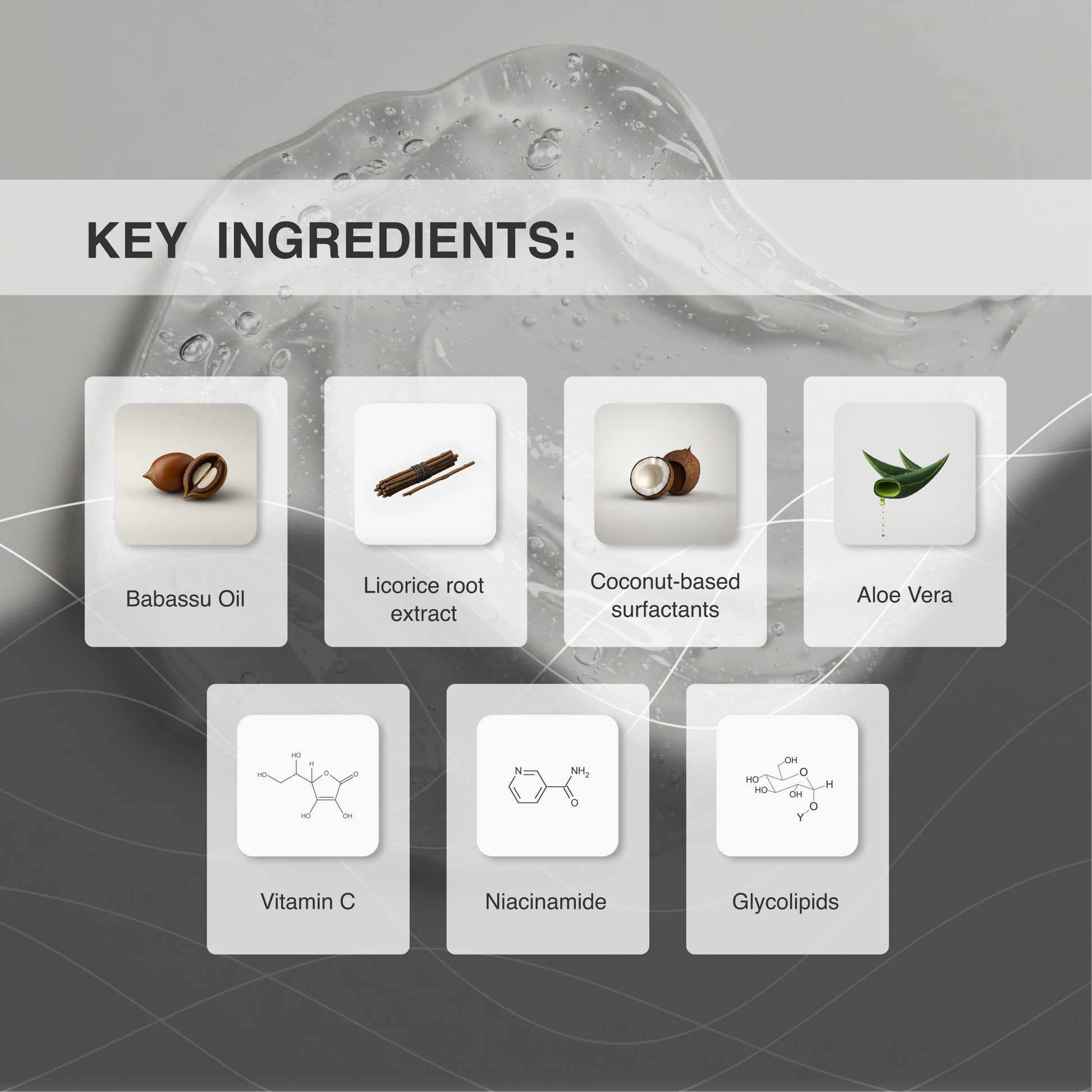 Babassu Oil | Licorice Root Extract | Coconut-based Surfactants | Aloe Vera | Vitamin C | Niacinamide | Glycolipids